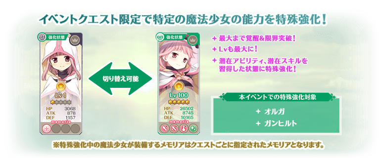 対象の魔法少女を編成して本イベントクエストをプレイする際に、ステータスを特殊な状態に強化することができます。