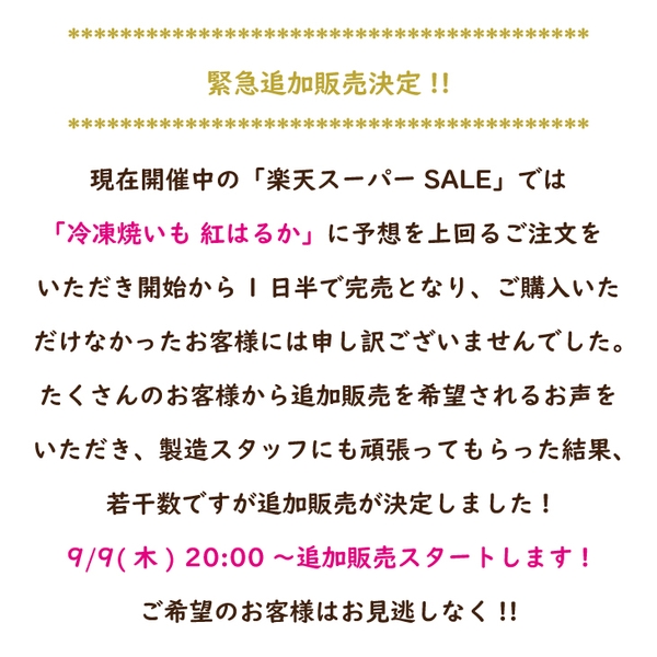 楽天ショップ【おうちdeボンマルシェ】では、大好評により1日半で完売してしまった「冷凍焼いも 紅はるか」を数量限定で追加販売いたします。楽天ランキング1位を獲得し、早くも再販のお声たくさんいただいておりましたので、製造スタッフに頑張ってもらい、何とか若干数ご用意することが出来ました。今回もご注文殺到が予想されますので、ご希望のお客様はお見逃しなく!!