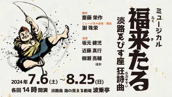 ミュージカル『福来たる~淡路ゑびす座狂詩曲(らぷそでぃ)~』は、宝塚歌劇団出身で同劇団や劇団 四季の演出等を手掛ける、日本を代表する演出振付家の謝珠栄氏が作・演出・振付を担当。劇団四季「ライオンキング」初代シンバ役を演じた坂元健児氏や、劇団四季出身で、「えんとつ町のプぺル」で主演を務めた近藤真行氏、音楽座や坊ちゃん劇場など数々の作品で主演を務めた柳瀬亮輔氏らをゲストに迎え、戦後の淡路島で経営難に苦しむ芝居小屋「ゑびす座」を舞台に、日々奮闘する人々と商売繁盛の神様“えびす様”との出会いをオリジナルストーリーで演じます。