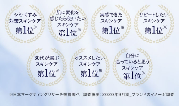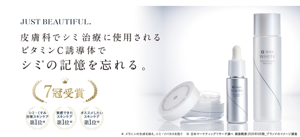 日本マーケティングリサーチ機構が、2020年9月にブランドのイメージ調査を実施した結果、MRB株式会社の「MRB薬用 美白スキンケアセット」が、『シミ・くすみ対策スキンケア第1位』『肌に変化を感じたら使いたいスキンケア第1位』『実感できたスキンケア第1位』『リピートしたいスキンケア第1位』『30代が選ぶスキンケア第1位』『オススメしたいスキンケア第1位』『自分に合っていると思うスキンケア第1位』に選ばれました。