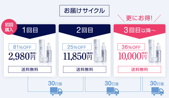 単品合計17,380円(税込)が、初回は81%OFFの2,980円(税別)2回目は25%OFFの11,850円(税別)3回目以降は36%OFFの10,000円(税別)と続けるほどにお得になる定期お届けセットです。