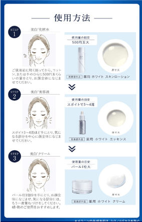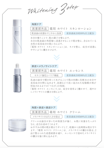 よりお肌への効果を実感していただく為、『肌表面の状態をすこやかに改善する美白化粧水』『セラミド強化をバリア機能を持つ美白美容液』『メラノサイトのはたらきを阻止する美白保湿クリーム』の3点セットでの使用する事をお勧め致します。