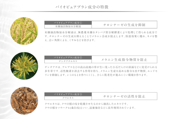そんな<ビタミンC誘導体>と独自処方で3種の保湿成分を含んだ美白サポート成分<バイオピュアブラン>の働きに加えて、抗炎症効果のある<トラネキサム酸>も有効成分として配合しており、シミへのアプローチが違う2つの成分がより効果を高めます。