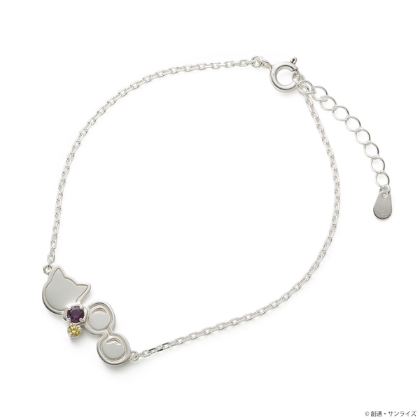 『機動戦士Gundam GQuuuuuuX』のニャアンをイメージしたシルバーブレスレットです。ネコとサングラスをモチーフに取り込み、イメージカラーストーンを2石セットしました。