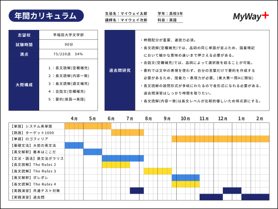 MyWay+では、多くの逆転合格実績を持つ大学受験のプロ講師が、生徒一人ひとりの学習スタイルに合わせた年間カリキュラムを提供します。