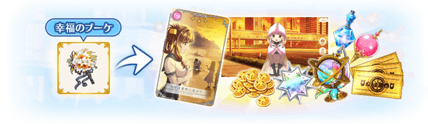 本イベントで獲得した「幸福のブーケ」は限定メモリア「幸せは黄昏に溶けて」や限定ホーム背景「あしたの幸せに花束を」そのほか貴重なアイテムとも交換できます。