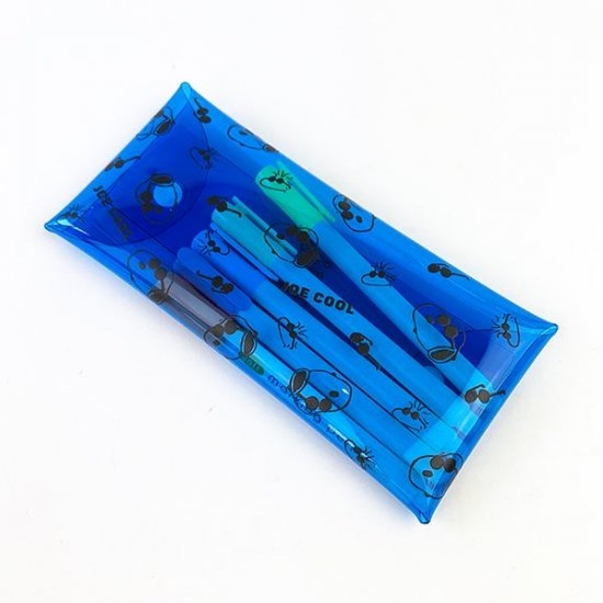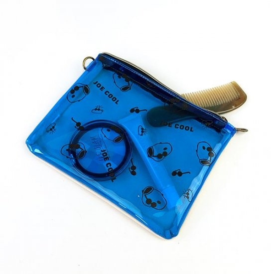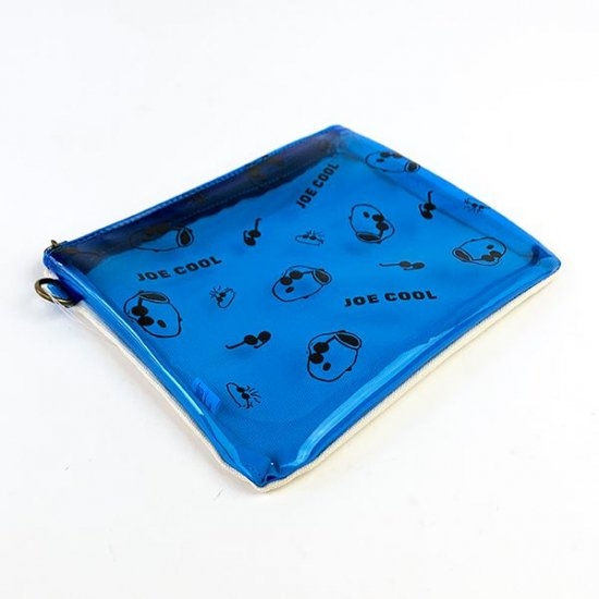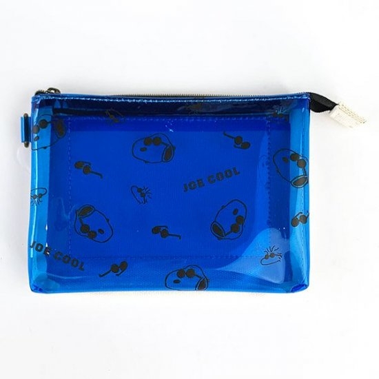 ブルーのポーチは、ジョークールスタイルのスヌーピーやサングラスなどの総柄になっています。濃いめのブルーですが、スケルトンなので涼し気です♪
