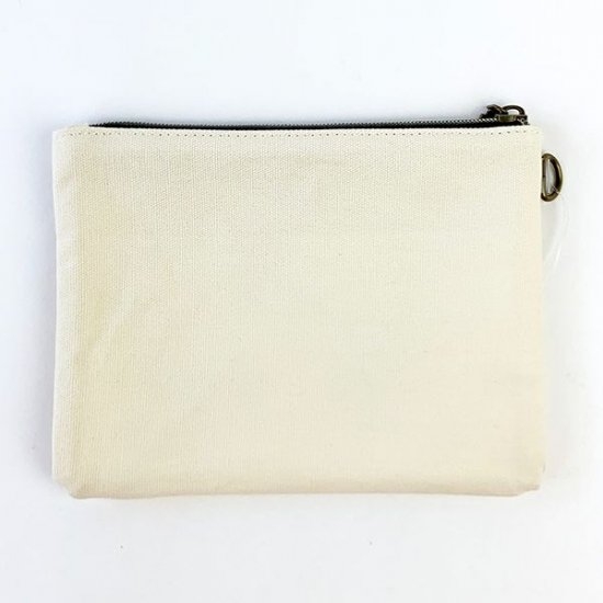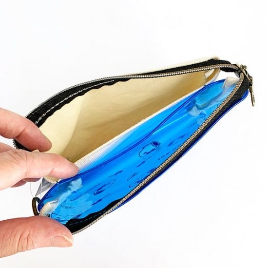 表面はクリア素材で、ジョークールのデザイン。そして、裏面は帆布素材になった、異素材MIXなオシャレポーチなんです。