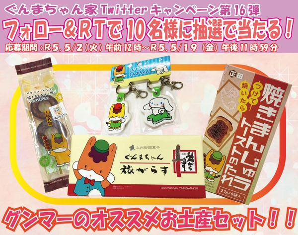 「グンマーのオススメお土産セット」が当たる!! ぐんまちゃん家公式Twitterキャンペーン第16弾を開催中!5月19日(金)午後11時59分まで!!