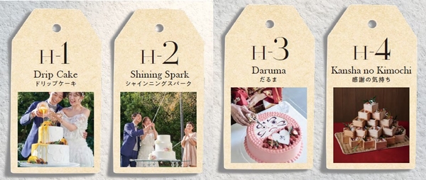 「ケーキ入刀」に代わり、ウエディングケーキを使って個性的な演出を行っていただけるケーキが登場。ゲストの目の前でソースをかけ流してウエディングケーキを完成させる「ドリップケーキ」、バルーンを開くとコンフェッティが降り注ぐ「シャイニングスパーク」、だるまに目を描いて完成させる和装におすすめのケーキ、ケーキの代わりに小さな桝に入れた手毬寿司をお配りする演出など、 「ケーキ入刀」に代わる個性的な演出が満載。