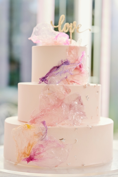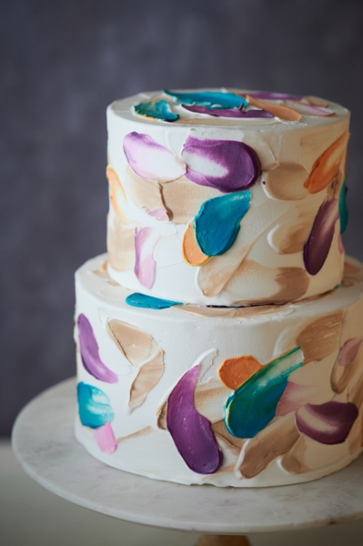 真っ白なキャンバスに個性あふれるカラーで描かれたウェディングケーキ。写真映え間違いなしです。