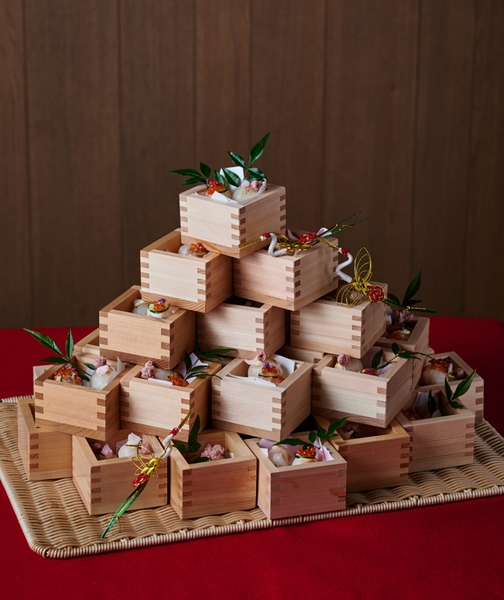 感謝の気持ちを届けるおもてなしの心をかたちに。縁起の良い桝に手毬寿司を入れて、おひとりおひとりにお配りします。桝に入ったいくらをふたりでかけて仕上げるオプションも。