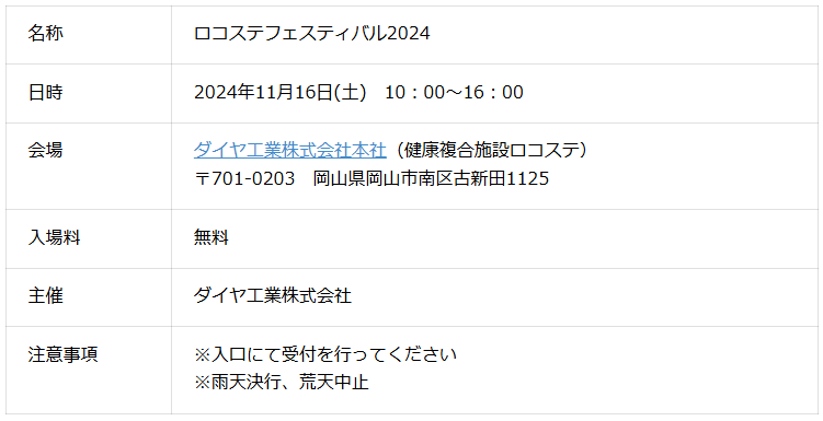 医療用品メーカーのダイヤ工業株会社(本社:岡山県岡山市 代表取締役:松尾浩紀)は、2024年11月16日(土)に健康複合施設ロコステ(岡山県岡山市南区古新田1125)にて、ロコステフェスティバル2024を開催いたします。子どもから大人までお楽しみいただけるたくさんの企画をご用意しております。皆さまのご来場をお待ちしております。