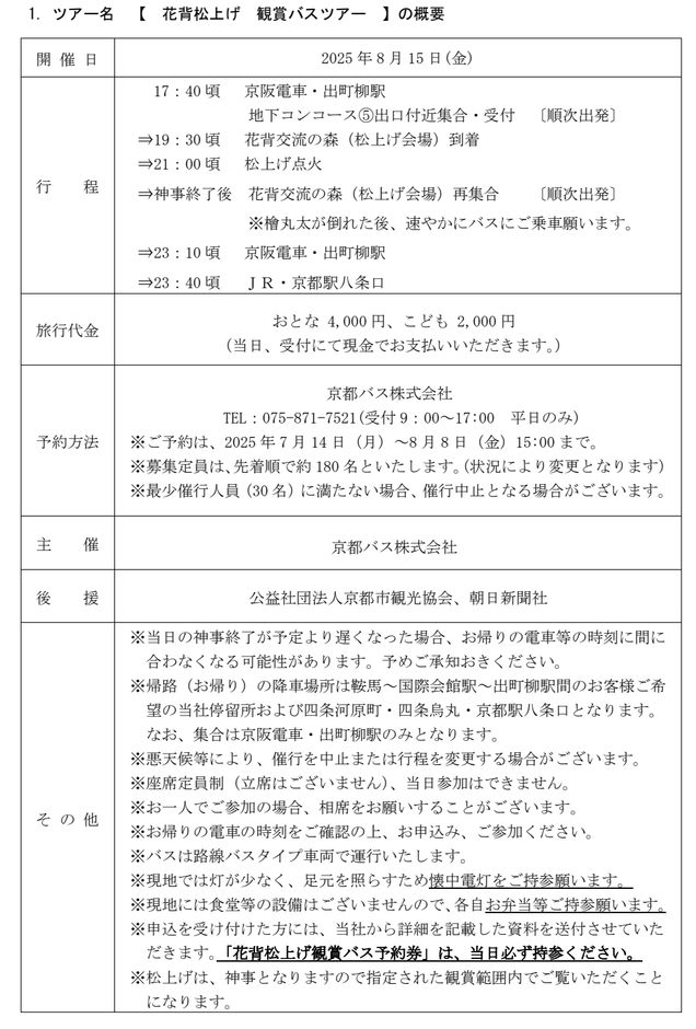 京都バス株式会社(本社:京都市右京区 代表取締役社長:吉本直樹)は、2025年8月15日(金)に左京区花脊八桝町にて催される「花背松上げ」、2025年8月24日(日)に左京区広河原下の町にて催される「広河原松上げ」行事に合わせ、「観賞バスツアー」をそれぞれ企画・販売します。例年、当ツアーは帰着地を京阪電車出町柳駅としていましたが、本年は四条河原町・四条烏丸・京都駅八条口まで範囲を広げ、京都市内中心部にご宿泊のお客様にもご利用いただきやすいツアーとしました。