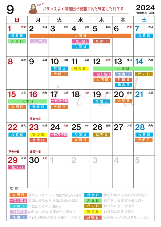 【開催内容】吉日カレンダー2024年9月版