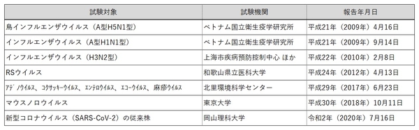 これまでに実証されたウイルスの試験項目