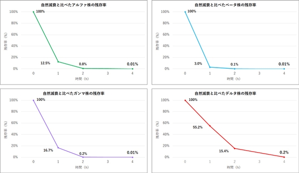 ストリーマを照射してから4時間後のウイルスは、自然減衰と比べて、アルファ株、ベータ株、ガンマ株が99.9%以上不活化され、デルタ株が99.8%不活化されたことが確認できた。