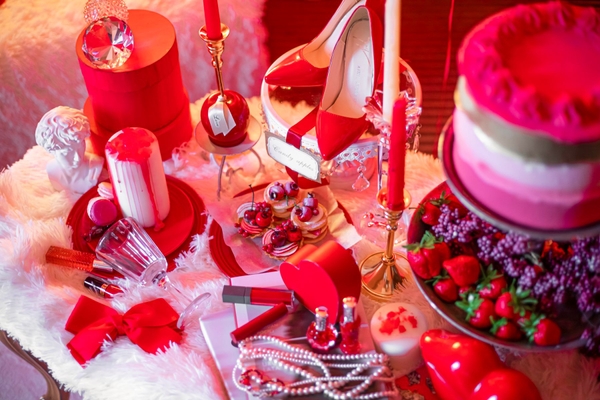 ①赤をテーマにしてハートのバルーンで飾られたRouge Red Room(大聖堂ビュー)でのバレンタインディナー付き