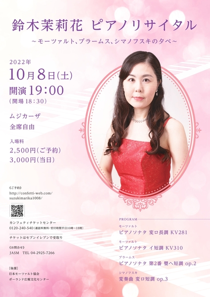 JASM主催、『鈴木茉莉花 ピアノリサイタル ~モーツァルト、ブラームス、シマノフスキの夕べ~』が2022年10月8日(土)にムジカーザ(東京都渋谷区)にて開催されます。