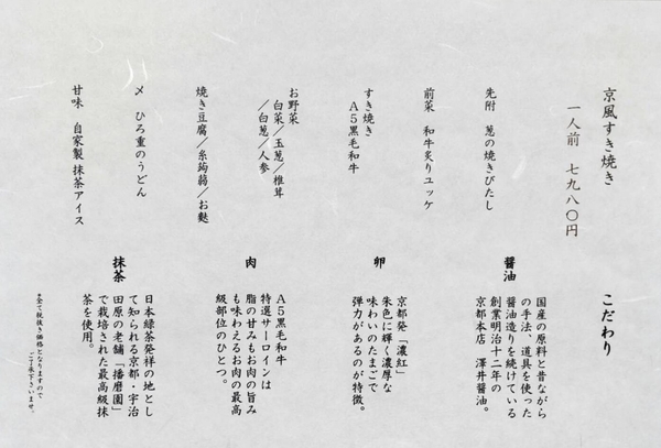 時代が変わっても当時と変わらない雰囲気を残すこの場所で、日本人にとって特別な料理であるすき焼きをこの地の雰囲気を感じながら1人でも多くの方に味わっていただきたく、この場所に暖簾を掲げるに至りました。