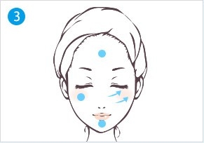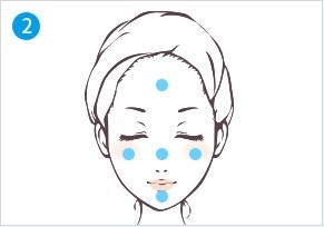 ②指先を使って顔の5点(右頬、左頬、額、アゴ、鼻)に乗せていきます。