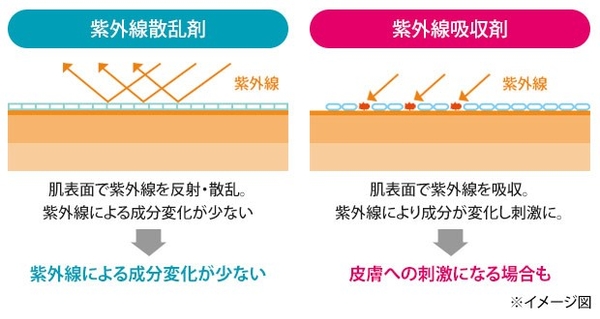 日やけ止めに使われる紫外線をカットする成分には、「紫外線散乱剤」と「紫外線吸収剤」があります。紫外線吸収剤はその性質上、敏感肌の方はまれに刺激を感じる方もいます。デイリーUVクリームは紫外線吸収剤を使用しておりません。