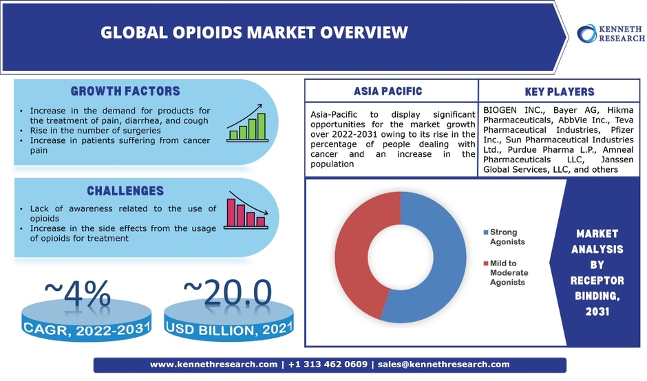 世界のオピオイド市場の成長は、2022年から2031年の間にCAGRが約4%の咳、下痢、および疼痛の治療用製品の需要の増加によって推進される