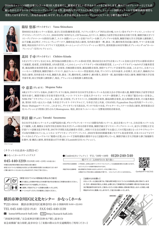 個々にソロプレーヤーとしても活躍しながら王子ホールでのベートーヴェン・チクルス等、意欲的なプログラムにも挑んでおり、ミュンヘン国際コンクールで委嘱新曲特別賞も受賞しておりますので、三善晃作品も楽しみです。そして、若手奏者によるベートーヴェンの《大フーガ》も聴き逃せません!