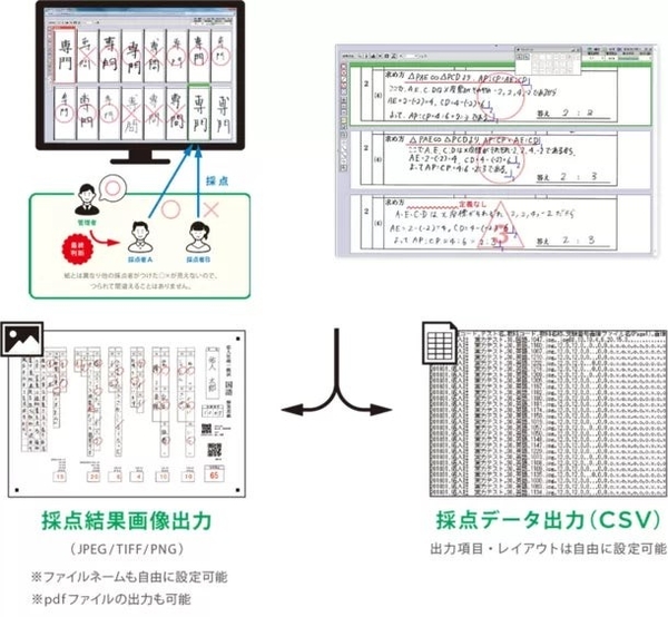 クラウド型デジタル採点支援システムです。企業・学校でのさまざまなテストの採点にご利用いただいております。専用の用紙は必要なく、現在お使いの解答用紙をそのまま使用可能です。設定が柔軟で細やかに設計できるためデジタルへの移行がスムーズです。シンプルかつ高機能の採点画面で、採点作業の効率化を図ります。点数計算や管理簿への転記も不要で、付帯作業の負担を大きく削減できるシステムです。