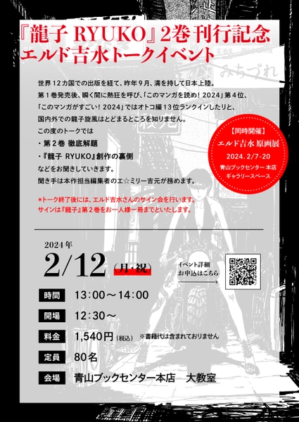 エルド吉水のデビュー作「龍子 RYUKO」第2巻の刊行を記念した原画展が、2月7日から20日にかけて、東京・青山ブックセンター本店で開催される運びとなりました。