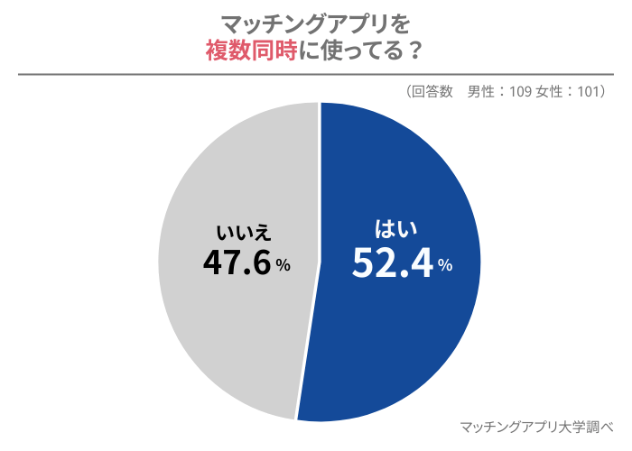 マッチングアプリの利用者はいくつのアプリを併用しているか調査してみたところ、「ある」52.4%、「ない」47.6%の結果となり、半数以上の方がアプリを複数利用している結果となりました。