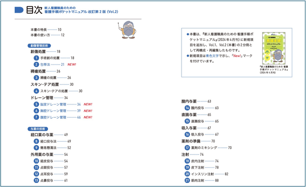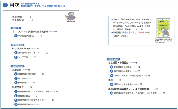 『新人看護職員のための看護手順ポケットマニュアル』は2024年4月30日に第1版が発売されて以来、多くの皆様にご活用いただいております。今回、新規項目を追加し、Vol.1、Vol.2の2分冊として再構成・再編集いたしました。