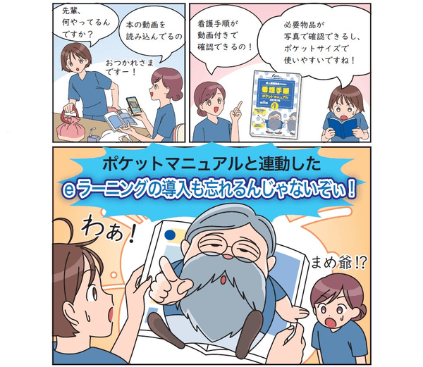 『新人看護職員のための看護手順ポケットマニュアル』×「S-QUE新人看護職員研修」eラーニングで、正確な技術と知識の習得にお役立ていただけます。