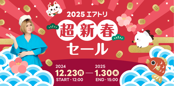 ITの力で、エアトリ旅行事業、ITオフショア開発事業、訪日旅行事業・Wi-Fiレンタル事業、メディア事業、投資事業(エアトリCVC)、地方創生事業、クラウド事業、クリエイティブソリューション&DX事業、マッチングプラットフォーム事業、CXOコミュニティ事業、法人DX推進事業・ヘルスケア事業(以降の事業は投資先にて注力)、人材ソリューション事業、AIロボット事業、ゴルフライフサポート事業、外貨自動両替機事業と町家宿泊・日本文化体験事業を含む全16事業を手掛ける株式会社エアトリ(本社:東京都港区、代表取締役社長 兼 CFO:柴田 裕亮、証券コード:6191、以下当社)は、本日12月23日(月)から超新春セールを実施いたします。