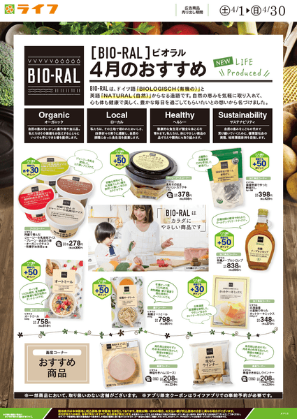 “BIO-RAL”とは、体に優しい素材や製法、健康や自然志向にあわせたプライベートブランド。「オーガニック」「ローカル」「ヘルシー」「サステナビリティ」をコンセプトにこだわりの商品を取りそろえています。首都圏ライフ127店舗およびビオラル4店舗にて、4月1日(土)から30日(日)までお試し価格にて販売、もしくはアプリ限定クーポンをご使用いただくとライフポイントをプレゼントするなど、お得にお買い求めいただけます。「健康にこだわった商品に興味があるけど買ったことがない」というお客様も、ぜひこの機会にお試しください。