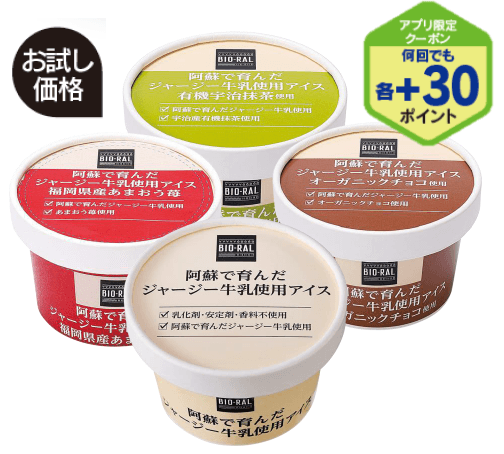 阿蘇で育んだジャージー牛乳使用アイス(プレーン・あまおう苺・オーガニックチョコ・有機宇治抹茶)