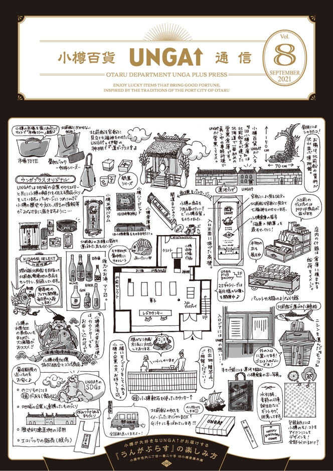 最新号vol.8のオモテ面は、お店のこと、商品のこと、コンセプトのこと、そのほかいろんな想いをギュッとイラストでわかりやすく描いています。より深堀して愉しみながら、小樽の歴史を伝える小樽百貨UNGA↑のお店づくり、商品づくり、イベントのことに興味を持っていただけたら嬉しいです。