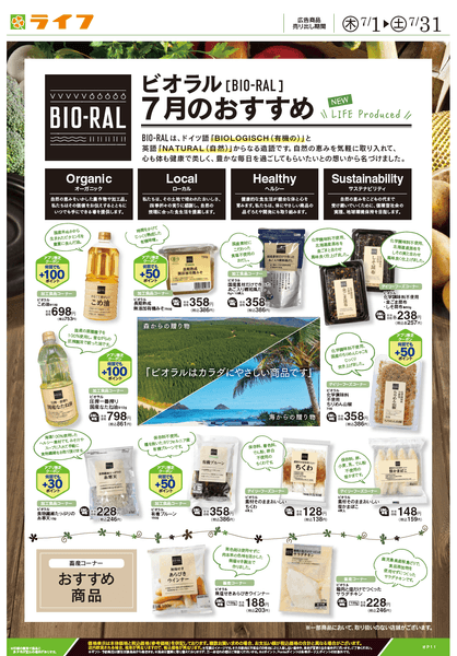 “おいしい” “ワクワク” “ハッピー” をお届けするライフコーポレーションは、健康志向のお客様におすすめしたいBIO-RAL(ビオラル)商品を、毎月お試し価格にて販売いたします。7月のおすすめは13品。そのうち「素材そのままおいしい笹かまぼこ」「素材そのままおいしいちくわ」「有機プルーン」「食物繊維たっぷりの糸寒天」「圧搾一番搾り国産なたね油」をご紹介いたします。