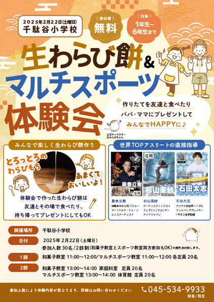 2025年2月22日(土)、千駄谷小学校の広々とした調理室にて『生わらび餅&マルチスポーツ体験会』を開催します。子供たちは、伝統の技を受け継ぐ熟練職人たちの丁寧な指導のもと、本格的なわらび餅作りに挑戦します。職人から直接学ぶ和菓子作りの技と心、そして出来立ての自作わらび餅を家族や友人と一緒に味わう喜びを体験できる貴重な機会となります。