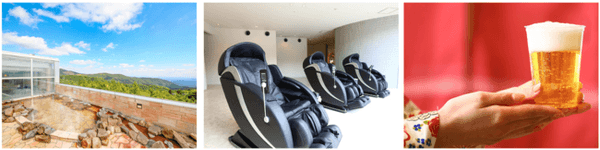 ◼️ ウェルカムソフトクリームやドリンクをご提供する「無料ラウンジ」には、歩き疲れてパンパンに張った足や、久々の運動による疲れをほぐす高性能マッサージチェアをご用意しています。どなたも無料で、ご自由にお使いいただくことができます。
