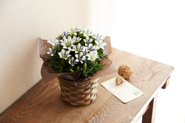 爽やかな白と青のストライプ模様が特徴のりんどう「白寿」は、99歳の長寿を祝う「白寿」に合わせて贈るのにおすすめです。バスケット、ラッピングでお届けします。
