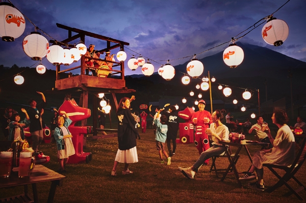 盆踊りの演奏は、日本百名山である磐梯山の大自然を望むホテル屋外の緑地で行われます。お祭りの会場内は、赤べこが描かれた提灯や、赤べこのオブジェ、赤べこ形をしたテーブルなどが設置されています。赤べこに囲まれながら夏祭りを楽しめるフォトジェニックならぬベコジェニックな空間です。