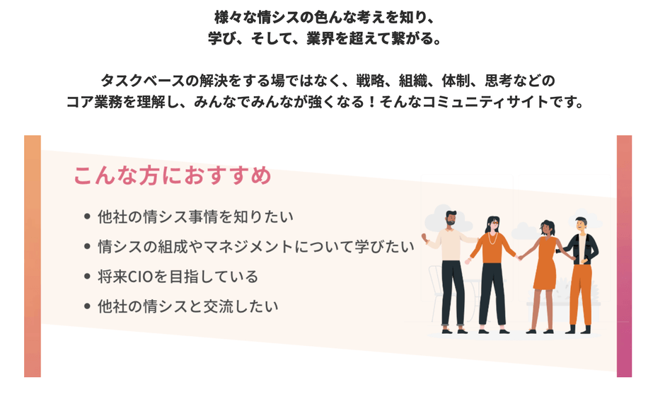 当コミュニティは、日々のタスクで発生した困り事をシェアするだけでなく、マネジメントや情シスの組織作りなど、より高い視座を持てる場を目指します。コミュニティ参加者それぞれが、日本企業を変革する、ITリーダーへの成長する背中を後押しできればと考えています。