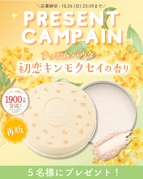昨年大好評だった「すっぴんパウダー 初恋キンモクセイの香り」が数量限定で今年も登場✨ただいま、プレゼントキャンペーンを10月26日(日)まで開催中!フォロー&いいねの簡単応募で当たる!!たくさんのご応募をお待ちしております!