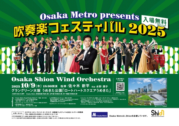 大阪市高速電気軌道株式会社(Osaka Metro)と公益社団法人 大阪市音楽団(Shion)は、、2025年10月9日(木)にグラングリーン大阪 うめきた公園の「ロートハートスクエアうめきた」で昨年に続き2回目となるオオサカ・シオン・ウインド・オーケストラによる「Osaka Metro presents 吹奏楽フェスティバル2025」を開催します。