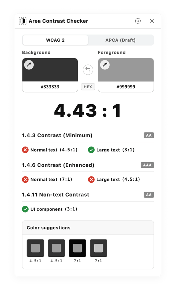 達成基準1.4.3、1.4.6、1.4.11に基づき、通常の文字(AA: 4.5:1、AAA: 7:1)、大きな文字(AA: 3:1、AAA: 4.5:1)、UIコンポーネント(AA: 3:1)のコントラスト比を評価します。