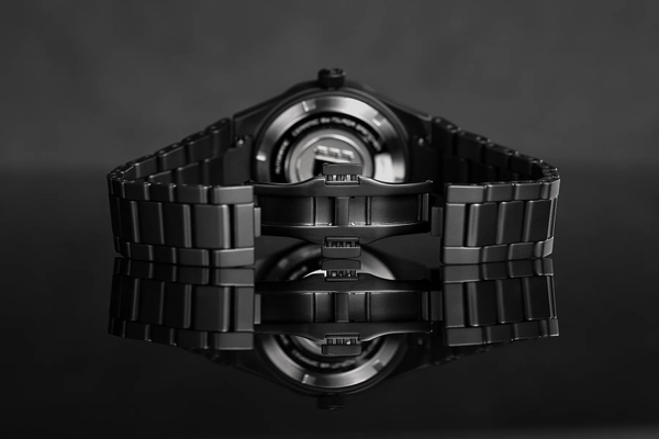 本作は、オリジナルデザインを忠実に再現しながら、ケース径37mm、厚さ12.85mmの絶妙なサイズバランスを実現。ブレスレットはセラミックケースと一体化する構造を採用し、統一感のあるモダンな美しさを演出しています。高品質なマットブラックセラミックを用いることで、優れた硬度と耐傷性を備え、軽量ながら高い強度を誇るため、日常使いにも最適。なめらかな仕上げにより、洗練された印象と高い耐久性を両立し、長く愛用できる理想的なタイムピースに仕上がっています。