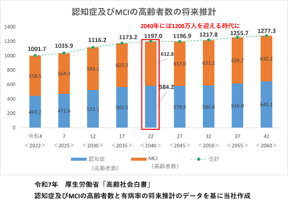 さらに、軽度認知障害(MCI)の高齢者も含めた認知症またはその予備群の総数は、2040年には約1,200万人に膨れ上がり、高齢者の約3.3人に1人が認知症又はその予備群となる時代が到来*します。
