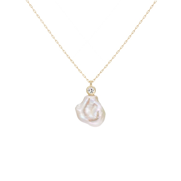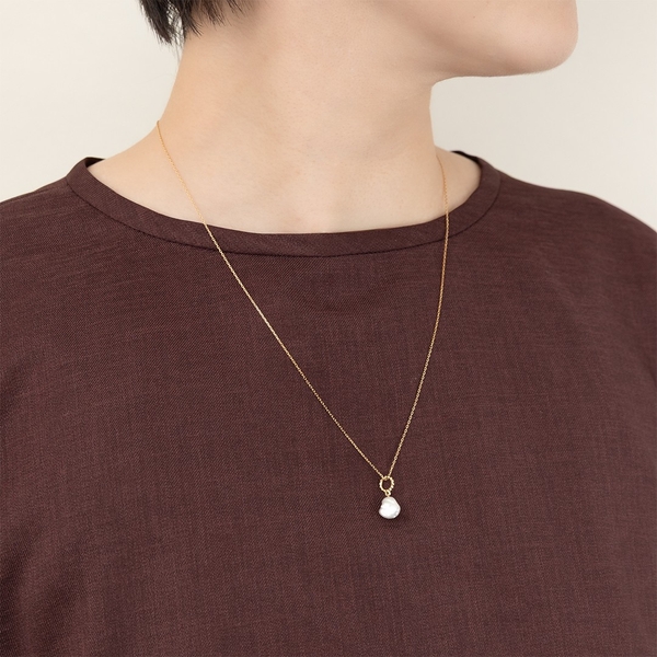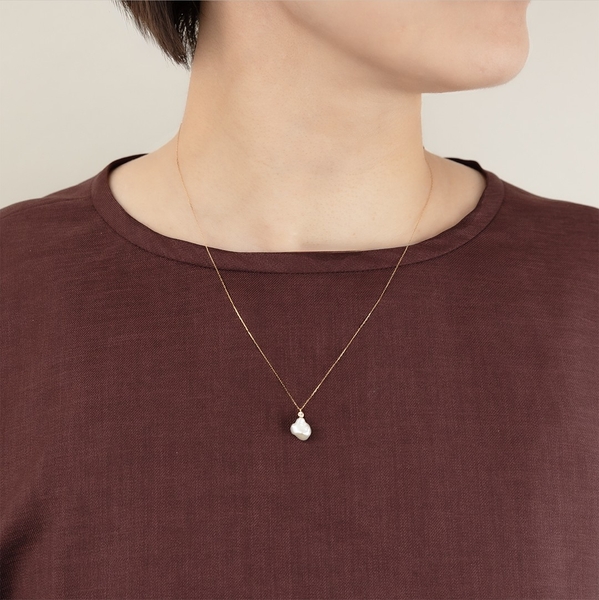 バロックパールと共に、きらりとメレダイヤモンドが輝くネックレス。ナチュラルな風合いのバロックパールも、メレダイヤモンドの輝きをプラスすることでぐっと上品な印象に。カジュアルなスタイルにもエレガントなスタイルにも合わせやすいデザインです。