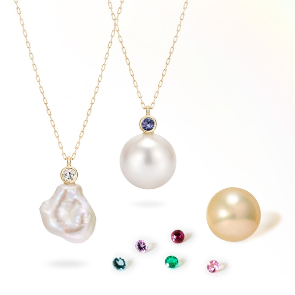 また、お好きなパールルースを使用して製作し、メレダイヤモンドをカラーストーンに変更するアレンジ等も可能です(画像右)。片方失くしてしまったピアスやイヤリングのパールを活用するなど、リフォームにも対応。例えば、誕生石をセットして出産記念品や誕生日プレゼントとして贈るのも素敵です。